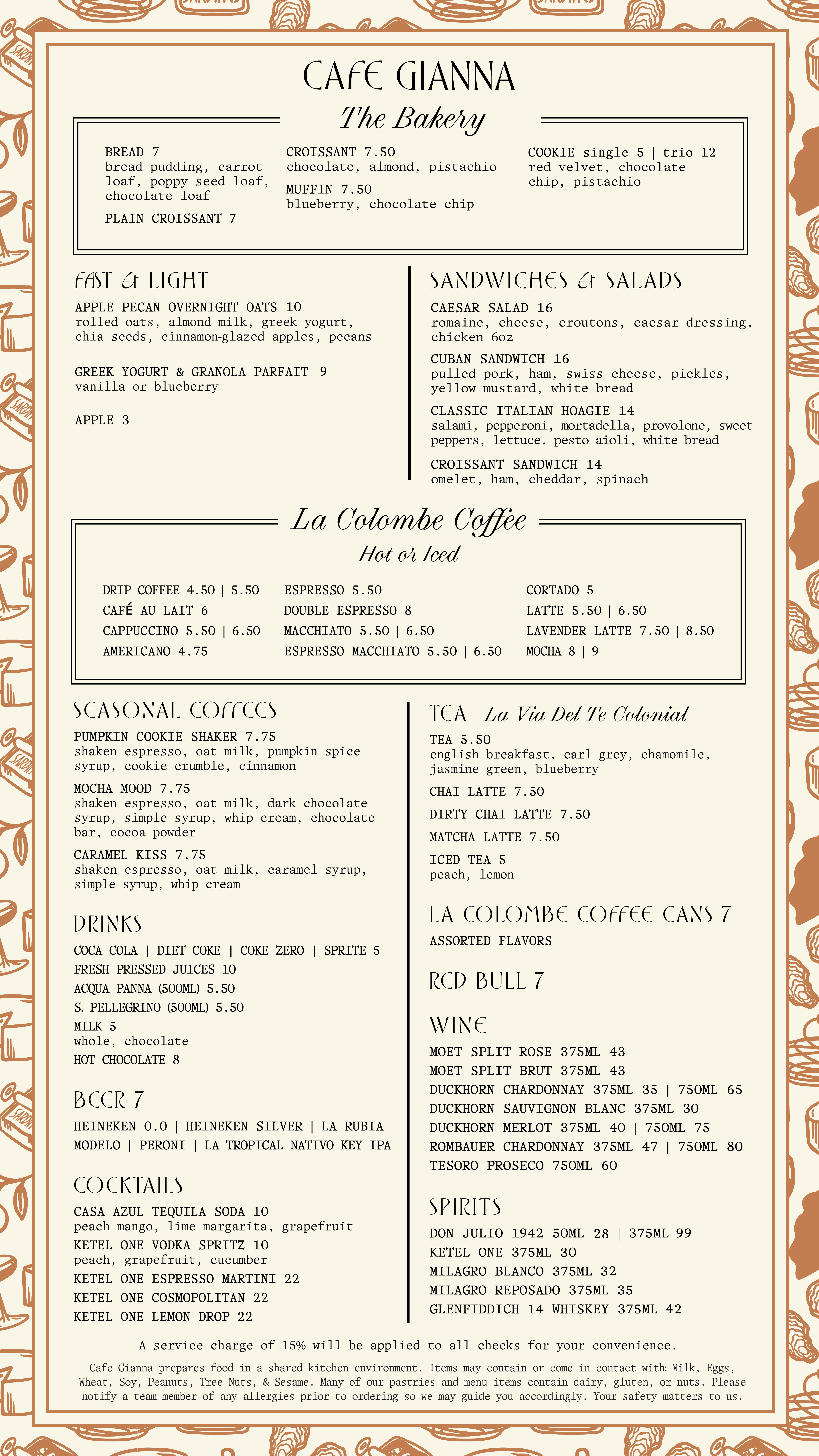 Service charge of 20% applied on all checks for your convenience. Must be ages 21+ to consume alcohol.